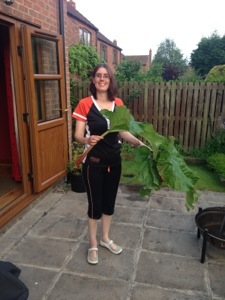 Mrs Fogg just about able to stand unaided with her home grown rudebarb.