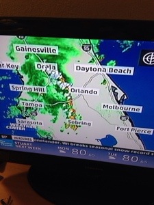 Putting on the many TV channels that discuss weather 24/7 we were cheerily told that Florida is experiencing unseasonably low pressure, the Gulf Stream is in the wrong place- oh and it’s now officially a tornado warning for Central and Eastern Florida. Heavy and damaging rain, winds and thunderstorms. Anyone for biking??