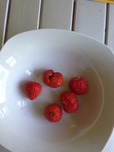 Our first crop of strawberries are ready. I’m impressed. From baby plants kindly supplied by Mr GreenThumb Caddie to actual rosy red strawberries ready for eating – and I managed not to kill the plants!